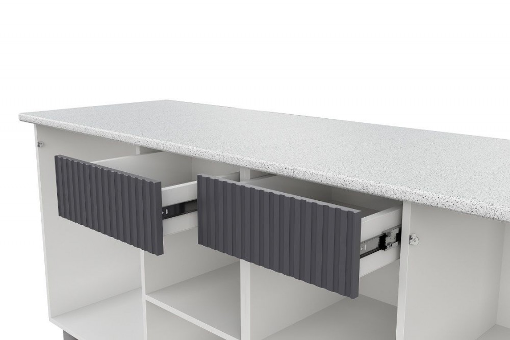 Особенности: Верхние и нижние створки, а так же накладки ящиков не имеют ручек.